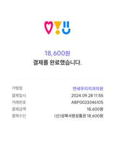 엑스레이 없이 스케일링만 18,600원이 나왔어요. 결제 직전에 서울페이 성북사랑상품권을 살 수 있나 봤더니 아직 구매가능하길래 얼른 2만원 충전! 이렇게 5% 결제 할인까지 받았답니다.👍🏻 전체적으로 빠르고 만족스러운 진료였습니다.