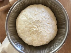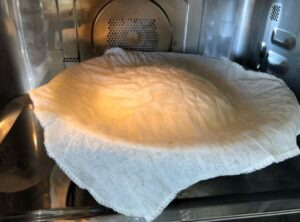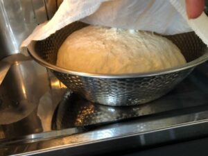 3. 동그랗게 만든 반죽에 젖은 타올 또는 랩을 덮어 따뜻한곳에서 1시간정도 발효한다. 전자렌지나 오븐에 따뜻한물 한컵과 함께 넣어두는 방법 괜찮습니다.