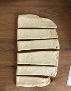 6. 반죽을 반으로 나눠 6개씩 두 판 만들 준비를 한다. 반으로 나눈 반죽을 직사각형으로 쫙 편다.