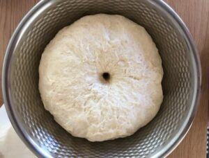 5. 반죽이 두배 정도 부푼것을 확인하고 손가락으로 찔렀을 때 바로 원상복귀 되지 않으면 발효가 잘 된 것이다. 몇 번 치대서 공기를 빼준다.