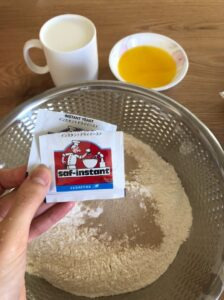 1. 반죽 가루 재료 - 강력분, 드라이이스트, 설탕, 소금 - 을 큰 볼에 넣는다. 강력분은 체에 한번 친다.