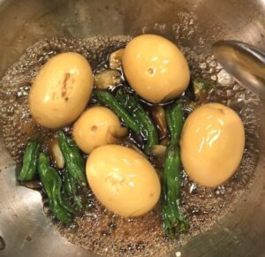 중불에서 계란과 양념을 서서히 졸이면서 물이 절반 정도 줄어들면 꽈리고추를 넣고, 가끔씩 냄비를 흔들어가며 졸여줍니다. 꽈리고추는 오래 익히지 않아야 아삭한 식감을 살릴 수 있습니다. 물이 약 ⅓ 정도 남을 때 불을 끄고 조림을 식혀줍니다. 식히는 과정에서 계란에 간장이 잘 배어들어 맛이 더욱 깊어집니다.