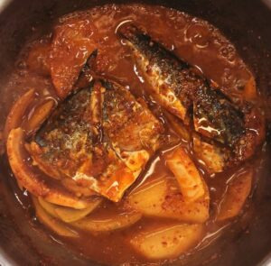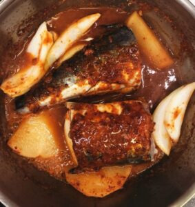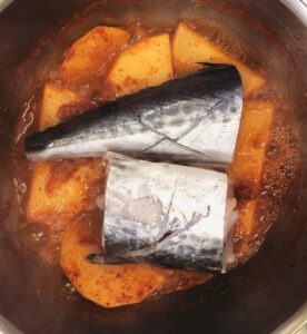 무가 익기 시작하면 준비해둔 생선을 무 위에 올립니다. 그 위에 남은 양념장을 골고루 바르고, 썰어둔 양파를 생선 위에 올립니다. 생선의 비린내를 없애기 위해, 양파를 올린 후 청주나 맛술을 약간 뿌려주면 더 효과적입니다.