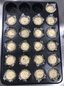 머핀 틀에 베이킹컵을 깔고, 짤주머니로 80% 정도 채워 반죽을 팬닝합니다.