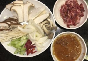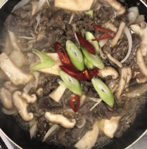 전골 육수를 부어 끓여가면서, 취향에 따라 간장양념 대신 시중의 일본식 스키야끼 소스로 응용해서 신선한 계란 노른자를 곁들여 먹을 수도 있고 손님 대접하기도 좋답니다.