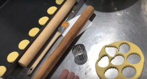 휴지한 반죽을 덧가루(강력분)를 얇게 뿌린 작업대에 올려놓고, 반죽이 부드럽고 매끄러워질 때까지 가볍게 치댑니다. 그 후 밀대를 사용해 반죽을 0.7~0.8cm 두께로 밀어주세요. 그런 다음 쿠키틀로 반죽을 찍어내어 팬에 팬닝합니다.