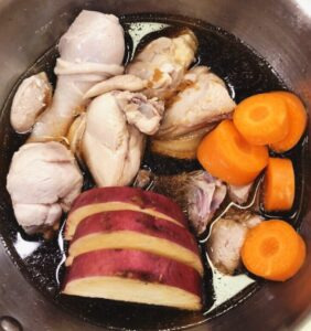 큰 냄비에 손질된 닭고기, 고구마, 당근, 양념장, 그리고 물 1컵을 넣고 뚜껑을 덮은 후 강불에서 끓입니다. 물이 끓기 시작하면 중불로 줄여 재료들이 골고루 익도록 조리합니다. 이때 당근과 고구마가 너무 익어 흐물거리지 않도록, 적당히 익었을 때 건져 놓는 것이 좋습니다.
