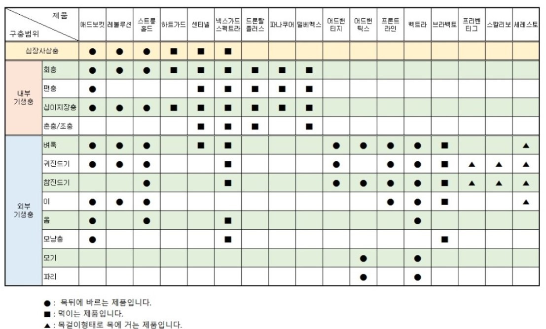 - 바르는 약: 어드밴티지, 어드밴틱스, 프론트라인, 벡트라