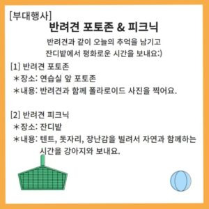 반려견 목걸이, 이름표, 뱃지 만들기나 플리마켓과 공연도 할 예정이라고 해요. 포토존과 피크닉존도 운영된다고 하니, 반려견과 가을소풍 겸 가보는것도 좋을듯 해요. 피크닉 용품과 장난감도 대여해준다고 합니다.