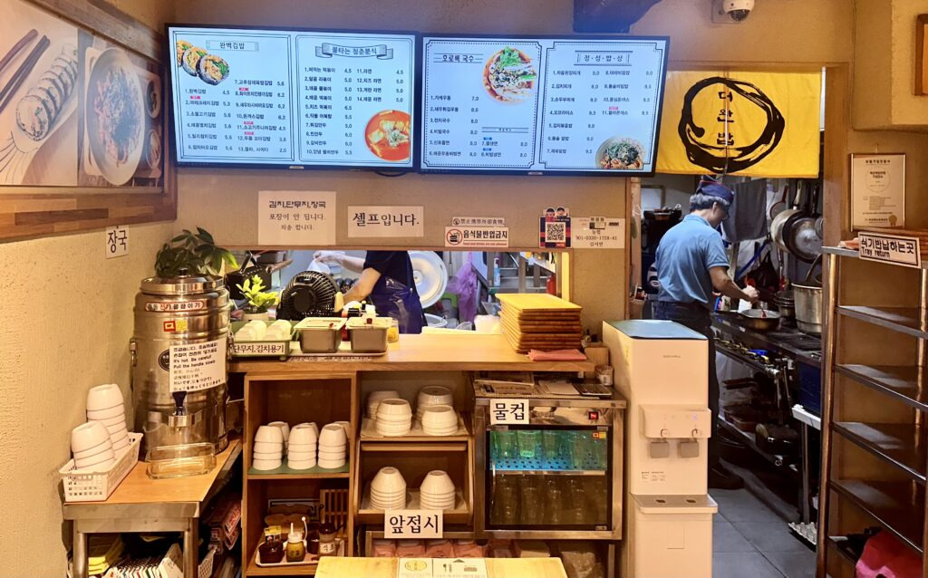 오른쪽 한편에 있는 키오스크로 주문하면 됩니다. 별로 붐비지 않는 아침이라 주인분이 직접 주문 받아주시기도 하네요. 물, 김치 및 단무지, 장국은 셀프서비스고, 음식도 다 먹으면 직접 식기반납하면 됩니다.