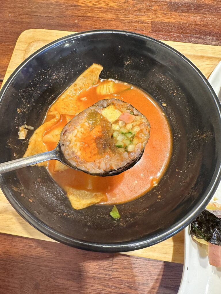 Dip the kimbap in the tteokbokki sauce! Even though I didn't eat the soup, the tteokbokki sauce alone made me feel warm and full.