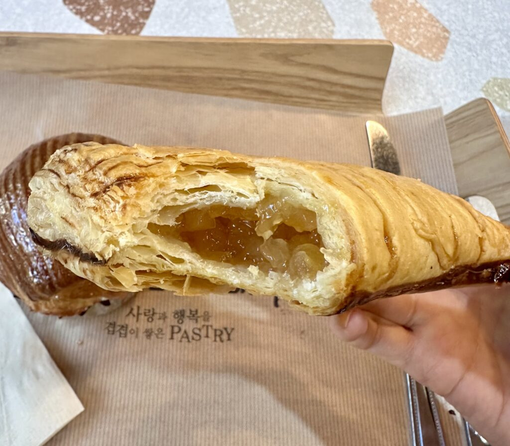애플파이 안쪽은 이런 모습입니다. 겹겹 페스트리 안에 달콤한 사과쨈, 개인적으로는 좀 더 시나몬 향이 나면 맛있을 것 같아요.