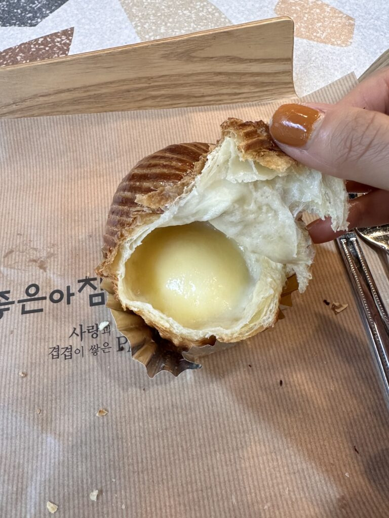 동그란 빵을 찢어보니 우유크림이 쏘옥,,, 비주얼만 봐도 맛있어요. 우유크림은 달달하고 고소합니다. 단것을 잘 못드시는 분은 너무 달게 느껴질 수는 있을 것 같아요. 이럴 땐 아메리카노 커피랑 궁합이 좋습니다. 빵을 찢어 크림과 같이 드시길.