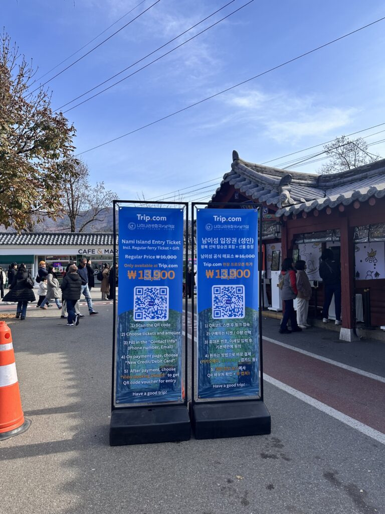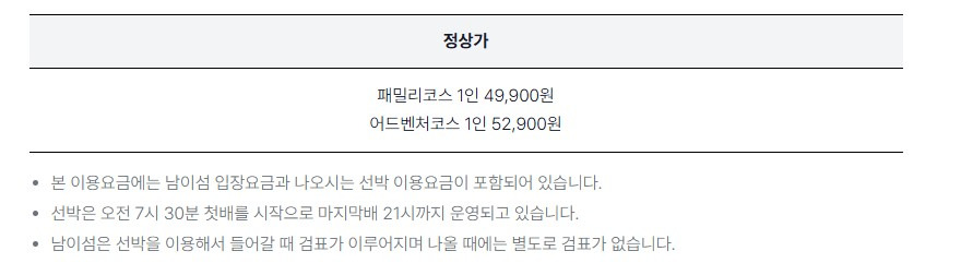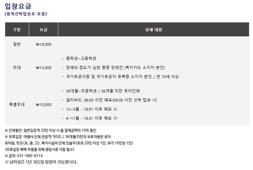 입장료에는 선박 왕복편이 포함입니다. 일반 16,000원. 남이섬 입장권은 인터넷으로 미리 구매가 가능합니다. 각종 할인도 있으니 미리 사서 가시는 것을 추천합니다.