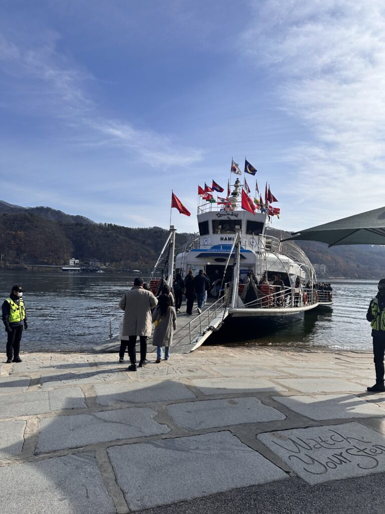 배는 여러 척이 부지런히 관광객을 싣고 남이섬을 오가고 있었습니다. 10분도 안걸리는 가까운 거리라 자리에 앉지 않아도 힘들지 않았어요. 일단 배를 탄다는 것에서 서울 근교가 아닌 듯한 느낌을 받았습니다. 물이 잔잔해서 멀미도 없고요. 이색적이었어요.