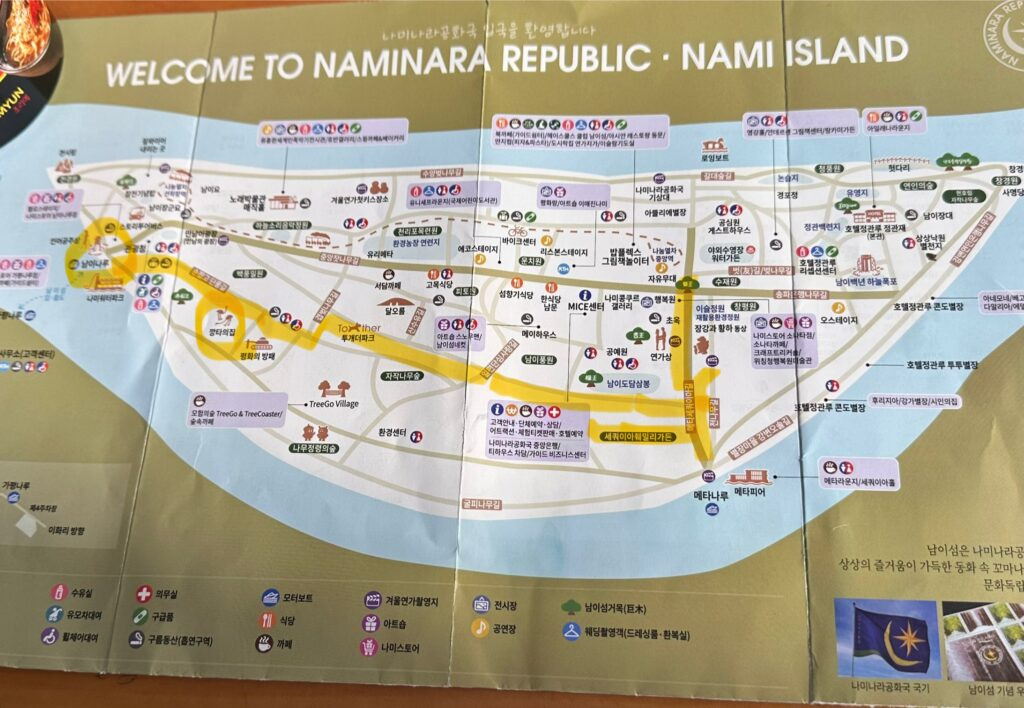 추천하는 루트는 위 지도의 노란색으로 표시한 길 입니다. 배에서 내린 남이나루에서 오른쪽으로 꺾어져 들어가는 길인데요, 이유는 중앙잣나무길등 다른 메인 로드에 비해 사람이 적고, 메타세콰이어 나무가 아름답게 느껴졌어요. 또한 중간에 타조를 볼 수 도 있고, 강아지가 있다면 리드줄을 빼고도 놀 수 있는 어질티니 체험공간(투개더파크)도 있었습니다.