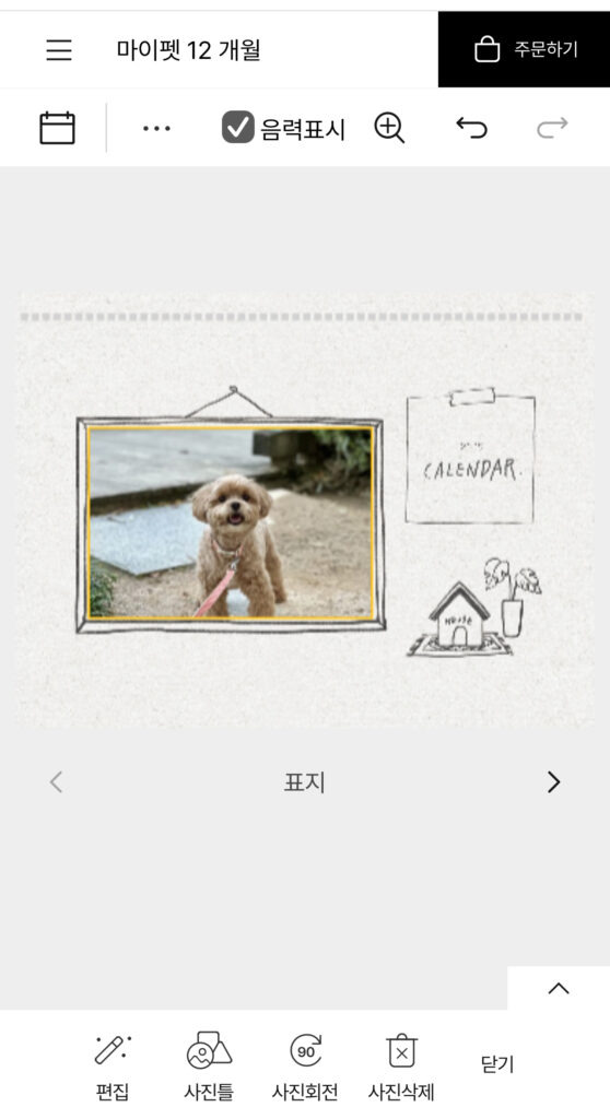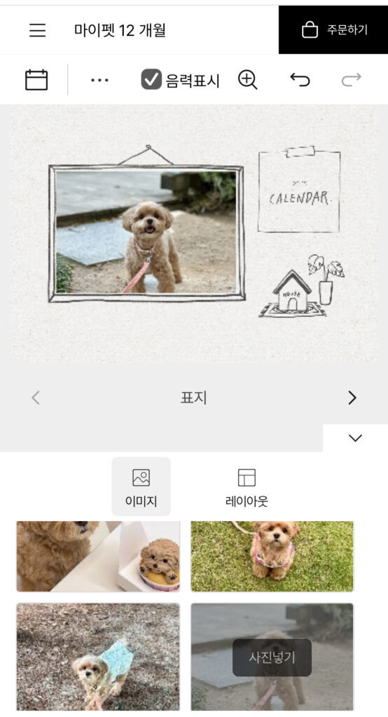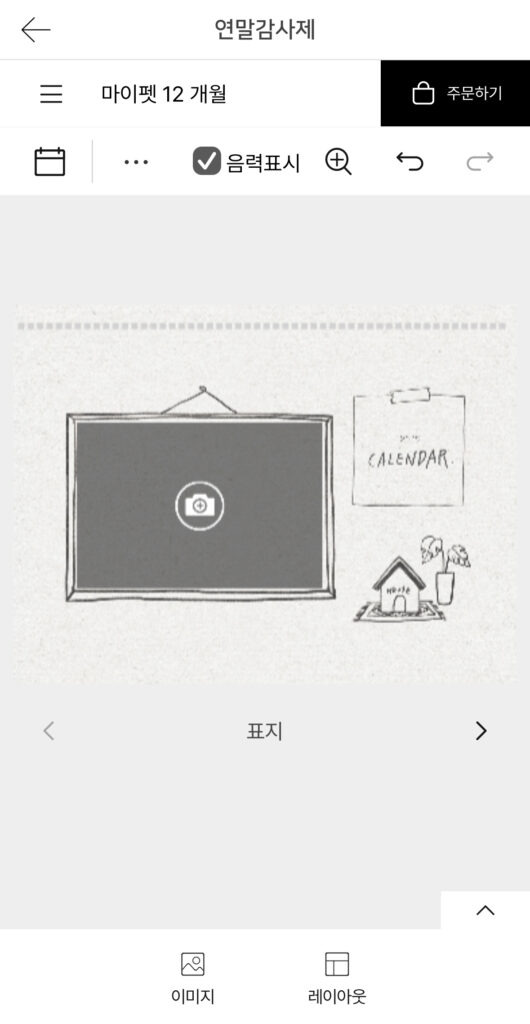 이렇게 표지를 만들고 다음 '>' 표시를 불러, 1월달부터 하나하나 사진을 넣어가면 됩니다. 한번에 작업을 다 못하더라도, 저장한 후 보관함에서 불러오기를 하면 되니까 편리해요. 단, 저장 기간 (약60일정도) 지나면 자동으로 삭제된다고 하니 참고해주세요.