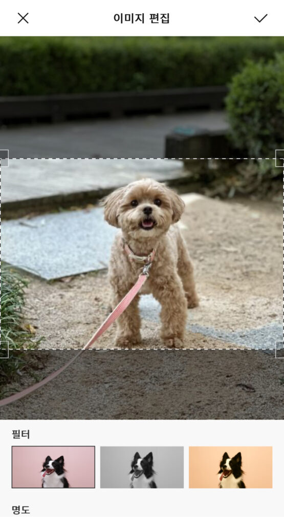 포토몬 편집기에서 사진을 어떤 크기로 넣을지 및 위치를 선택할 수 있습니다. 필터도 적용이나 명도 조절 등도 가능해요. 핸드폰 앨범에서 사진의 미세 조정을 안 해 놓았더라도, 포토몬 편집기에서 기본적인 것들은 조정 가능하니 엄청 편리하쥬?