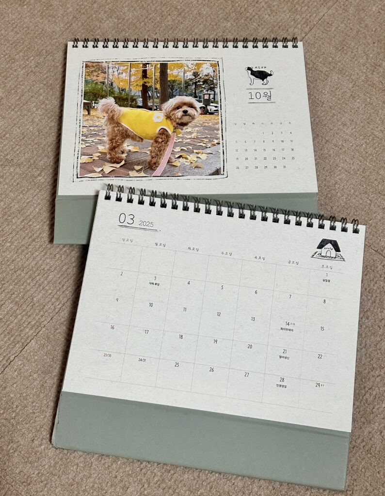 조금 작은 사이즈의 귀여운 탁상달력. 우리집 강아지 사진 위주로 만들었는데요, 회사에서 쓰려고합니다. 일하다 열받을때마다 귀여운 강아지 호두 얼굴보면서 힐링하게요 ㅋㅋ