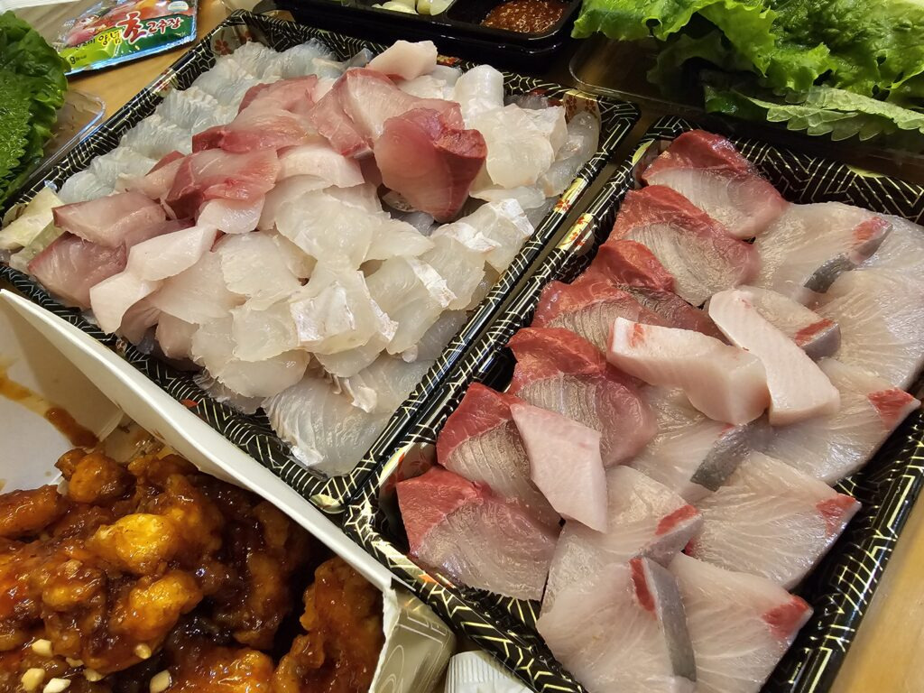 가게 안에 수족관에 활어들이 가득했습니다. 성수기라 미리 떠두신 회를 포장해주셨는데, 일행 모두 참 맛있게 먹었어요.