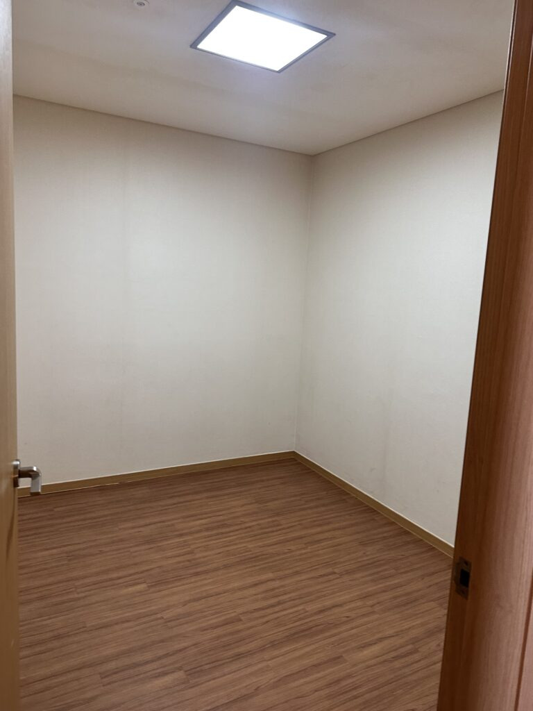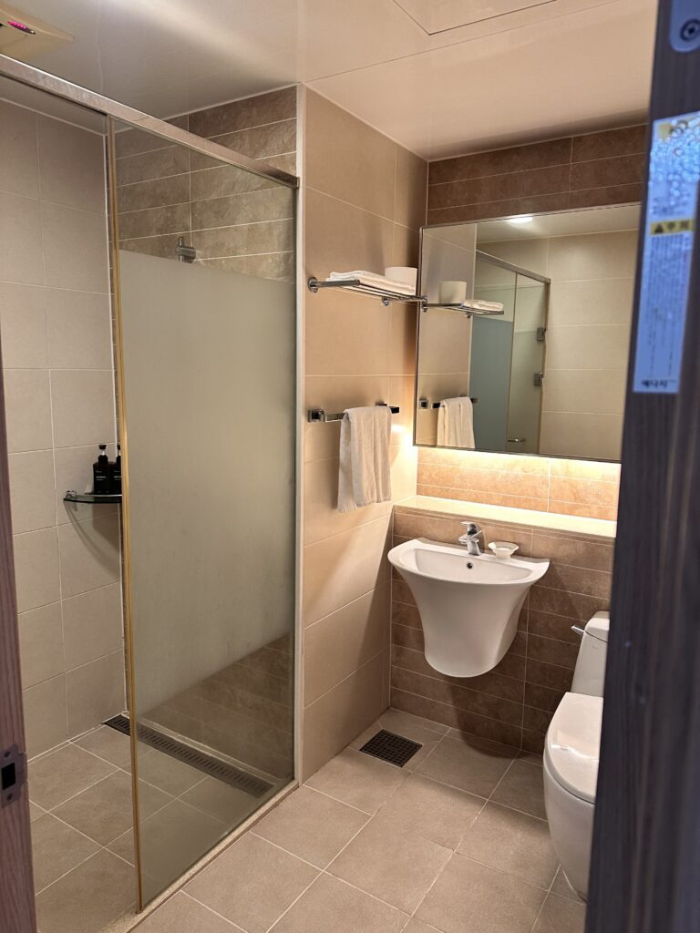 작은방은 온돌 형태로, 아무것도 없었어요. 이불깔고 두세명은 잘 수 있어요. 작은방 앞에 샤워부스가 있는 메인 화장실이 있었습니다. 큰 침대방과는 별도로 화장실이 또 있으니, 단체로 숙박하기에도 참 좋았어요.
