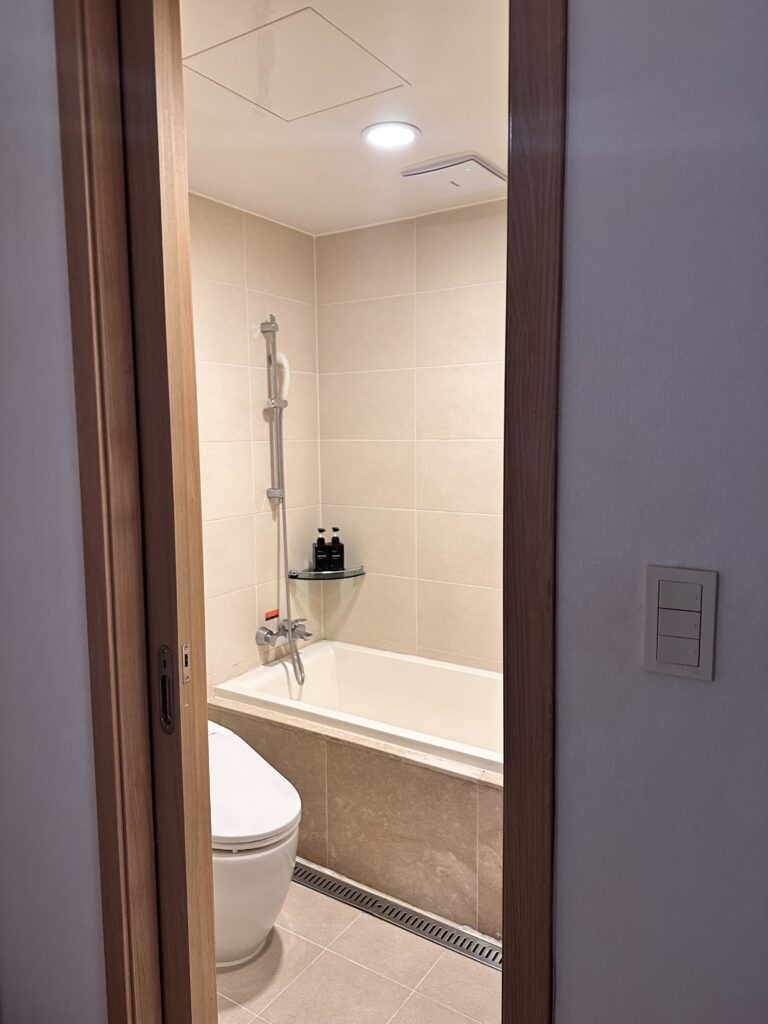 큰 방의 화장실에는 욕조도 딸려있어서 스키탄 후의 피로를 풀 수 있었답니다! 기본적인 샴푸와 바디샴푸는 비치되어있었어요. 깜박 잊고 안가져왔더라도 안심.