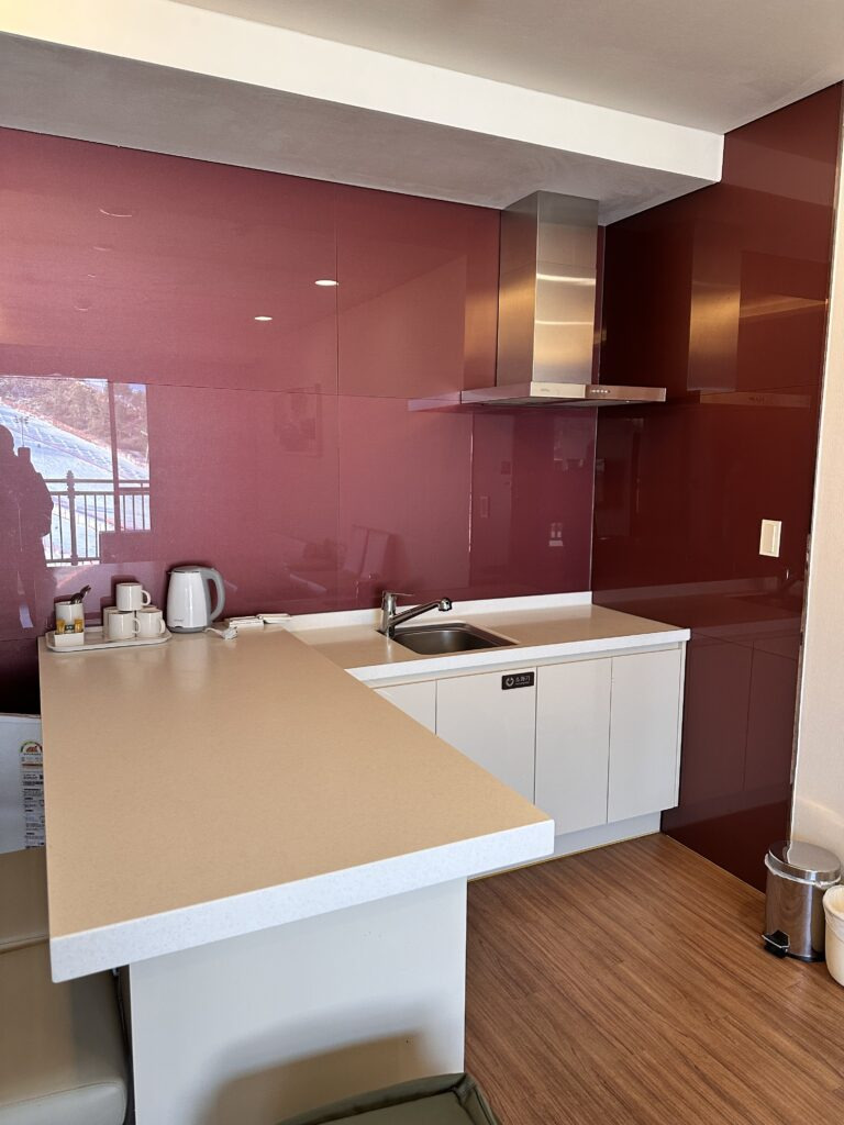 취사가 불가한 방이었기때문에 가스랜지는 없지만, 커피포트와 차, 머그컵, 작은 냉장고가 있었어요. 이번 여행은 편하게 배달이나 직접 사다가 먹을 생각으로 취사 불가한 방을 잡았어요. 덕분에 너무 편했습니다.