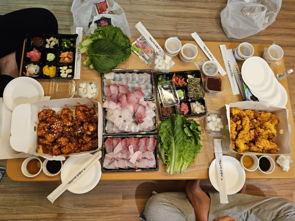 저녁에는 비발디파크 근처 횟집에서 회를 테이크아웃해서 먹었어요. 홍천의 스키장 근처 횟집이라 기대 안했는데, 와... 방어 광어 섞어서 구매했는데 무엇보다 신선하고 맛있었습니다.