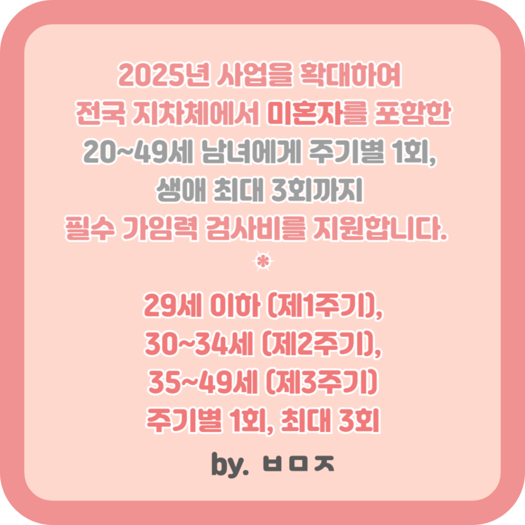 임신사전건강관리 (가임기 가임력검사) 지원은 2025년부터는 혼인 여부 상관없이, 미혼도 검사비를 지원 해준다고 합니다!