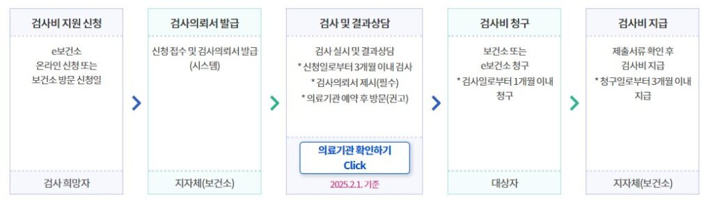 - 사업참여 의료기관에서 검사를 해야 지원을 받을 수 있어요. (미참여 의료기관에서 검사시, 지원불가) e보건소 홈페이지에서 참여 의료기관 리스트의 확인이 가능합니다.