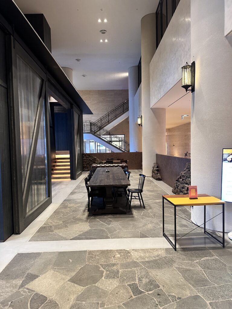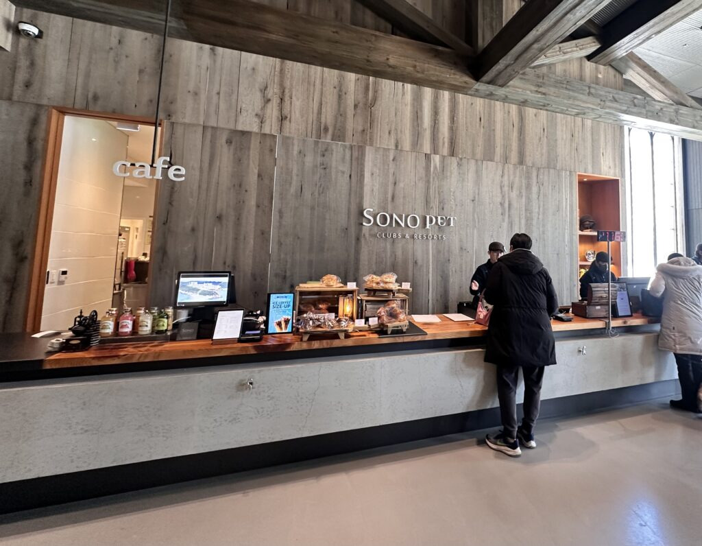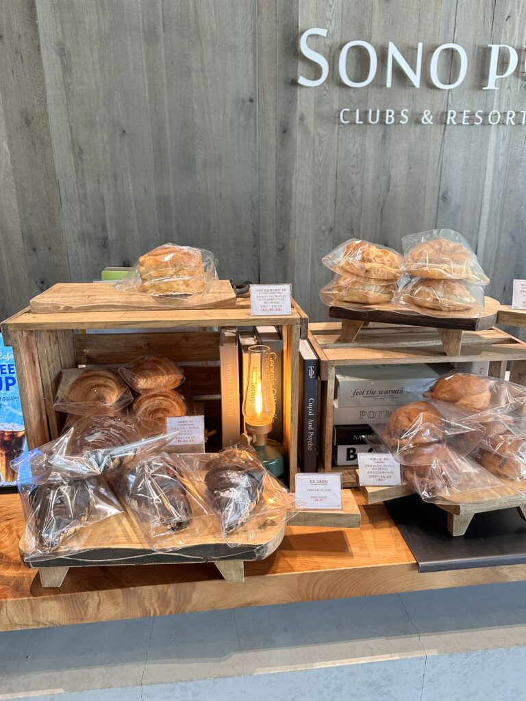 체크인 프론트 근처 카페와 테이블. 카페라기 보다는, 프론트에 작게 딸린 간이 매점? 같은 형태인데요, 오래 앉아있기 보다는 아마도 체크인을 기다리면서 음료와 빵 등을 간단히 먹을 수 있게 해놓은 것 같아요.