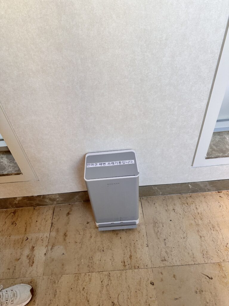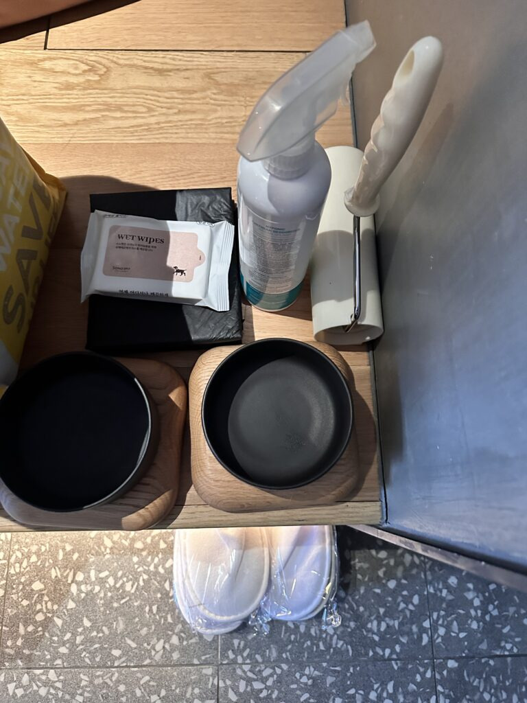 강아지를 위한 밥그릇, 물그릇, 강아지 배변 패드와 물티슈, 청소스프레이, 찍찍이가 준비되어있더라구요. 강아지패드는 다음날도 사람용 타올, 생수 2병과 함께, 바구니에 담아 가져다 주셨어요.