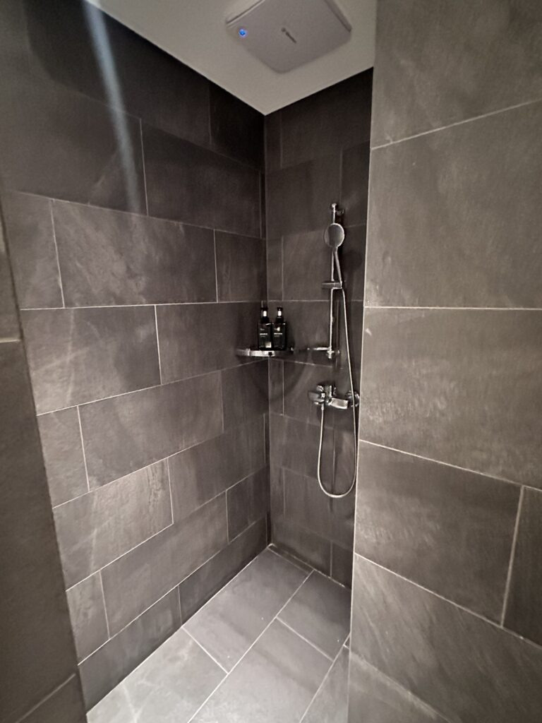 욕실 모습입니다. 한쪽은 샤워부스인데, 문과 턱이 없어서 강아지 발 씻기기에 편했어요.