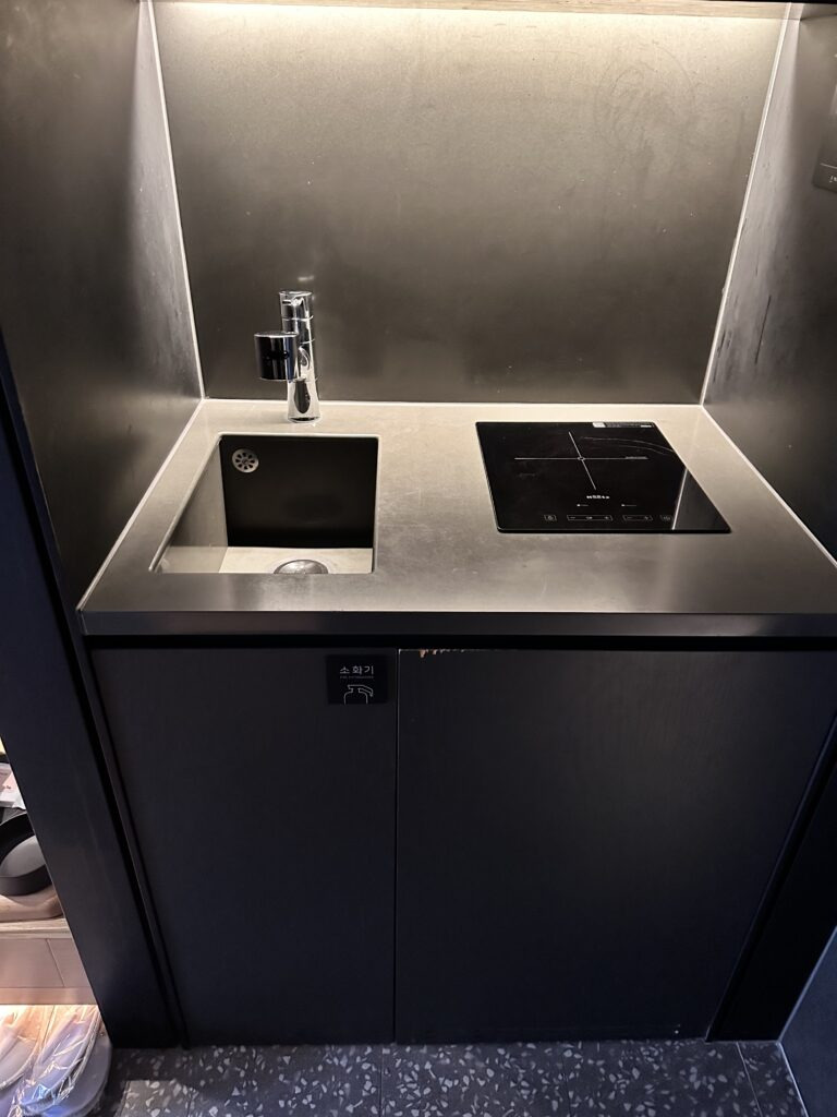 취사가 가능한 룸이긴한데, 소노펫은 키친이 정말정말 작아요. 냉장고도 작고, 인덕션 1구에 냄비도 1개뿐이고.. 심지어 전기포트는있지만, 밥솥은 없답니다. 비발디파크의 다른 일반 객실 취사형에 비해, 부엌 시설은 정말 좁고 부족한것 같아요. 아마 되도록 해먹지 말고 사먹으라는 뜻이 아닐까 생각이 들었답니다.