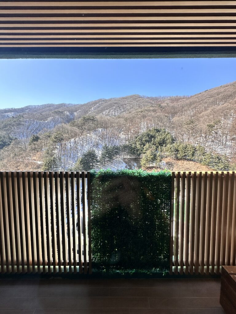 거실에서 바라본 뷰. 파크뷰라 스키장 뷰는 아니지만, 눈 내린 산이 아름다웠어요!
