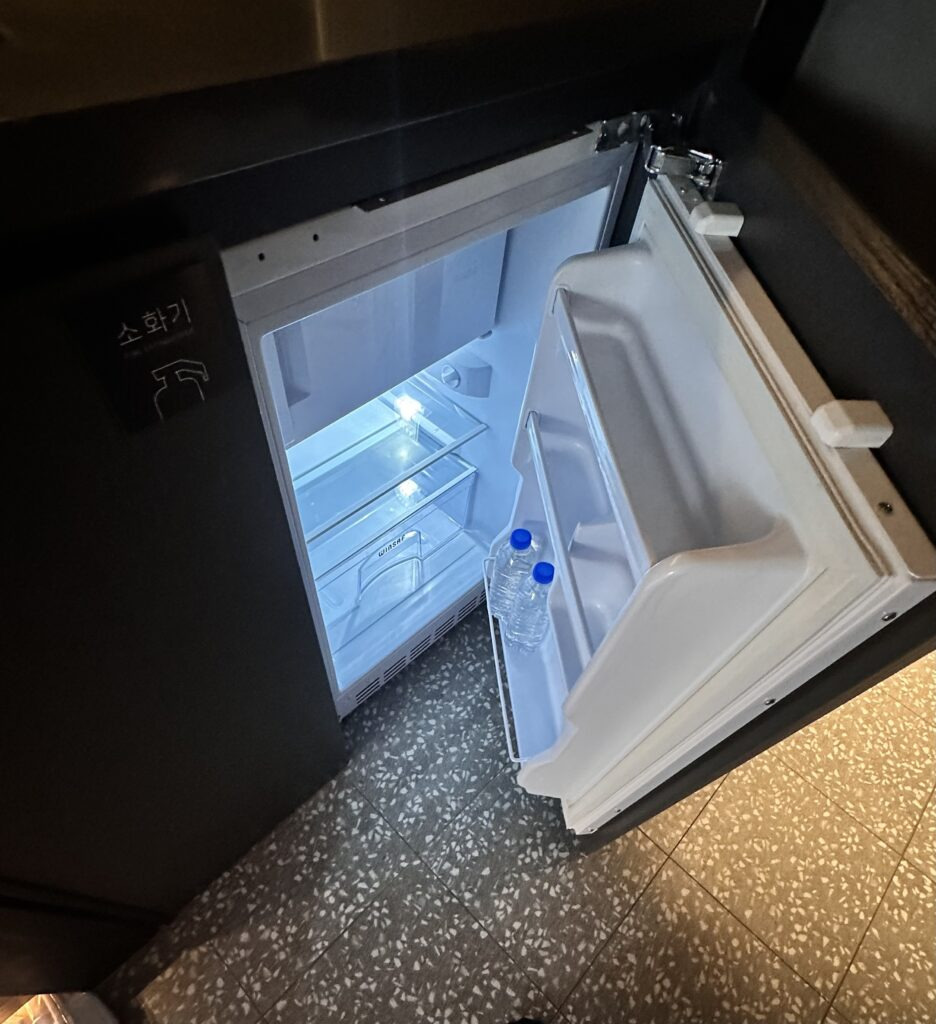 냉장고입니다. 너무 작아요.. 저희는 2박을 해서 음식 가져간게 좀 있었어도, 겨울이라 배란다에 내놓으면되서 괜찮았지만, 날이 따뜻할때는 작은 냉장고가 많이 불편할 것 같았습니다.