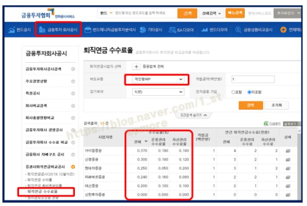 초창기에는 증권사의 경우 IRP계좌를 개설해서 돈을 넣어놓기만 하면 운용수수료를 떼는 경우가 있었는데요, 요즘에는 경쟁이 치열해서 그런지 수수료가 많이 낮아지고 거의 부과하지 않는 경우도 있습니다. 금융기관별로 시기에 따라 수수료가 다를 수 있기 때문에, 금융투자협회 홈페이지를 통해 확인하고 가입하는것을 추천합니다.