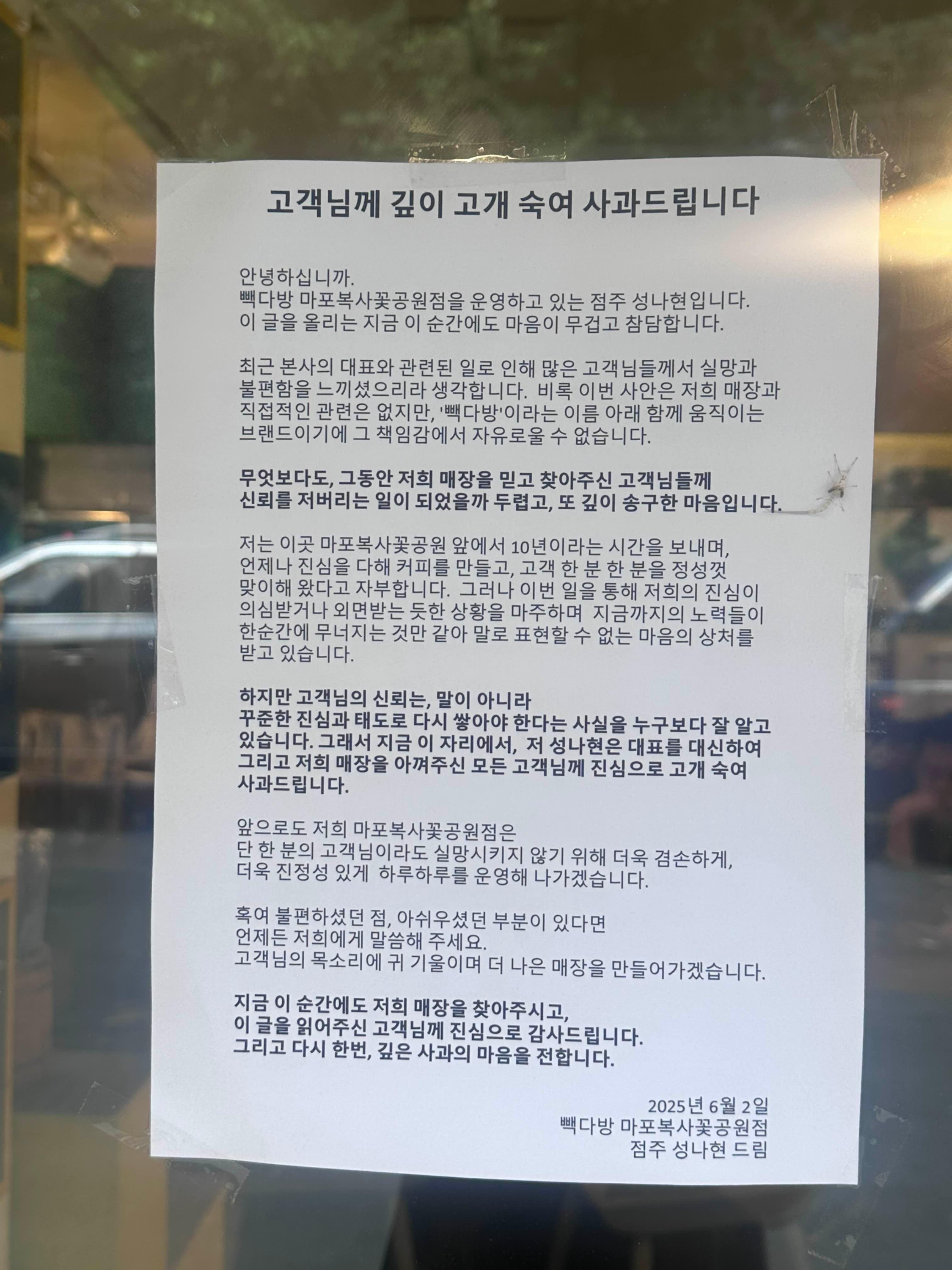 품질 개선에 노력하는 모습이 아닌, 준비도 안 된 성의 없는 저렴한 이벤트로 바이럴 마케팅에만 열을 올리는 더본과 빽다방 지점의 모습에, 진심은 젼혀 느껴지지 않았다. 한 명의 소비자로서, 더본 물품은 살 생각이 없어졌고 빽다방 또한 갈 생각이 없어졌다. 카페는 많다.