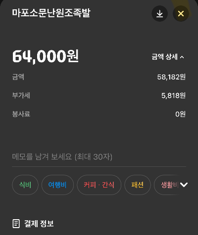 서울 시내에서 세명이 든든히 먹고 술도 마셨는데 이 가격이라니. 가성비에 놀랐음. 서울사랑상품권이나 마포사랑상품권은 아쉽지만 사용이 안된다고 함. 맛이 특별하다기 보다는, '가성비'때문에 재방문 의사 있음!